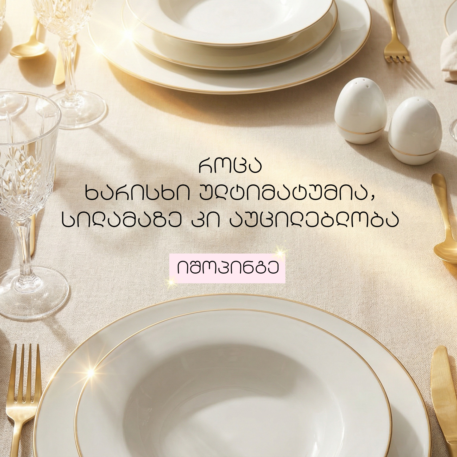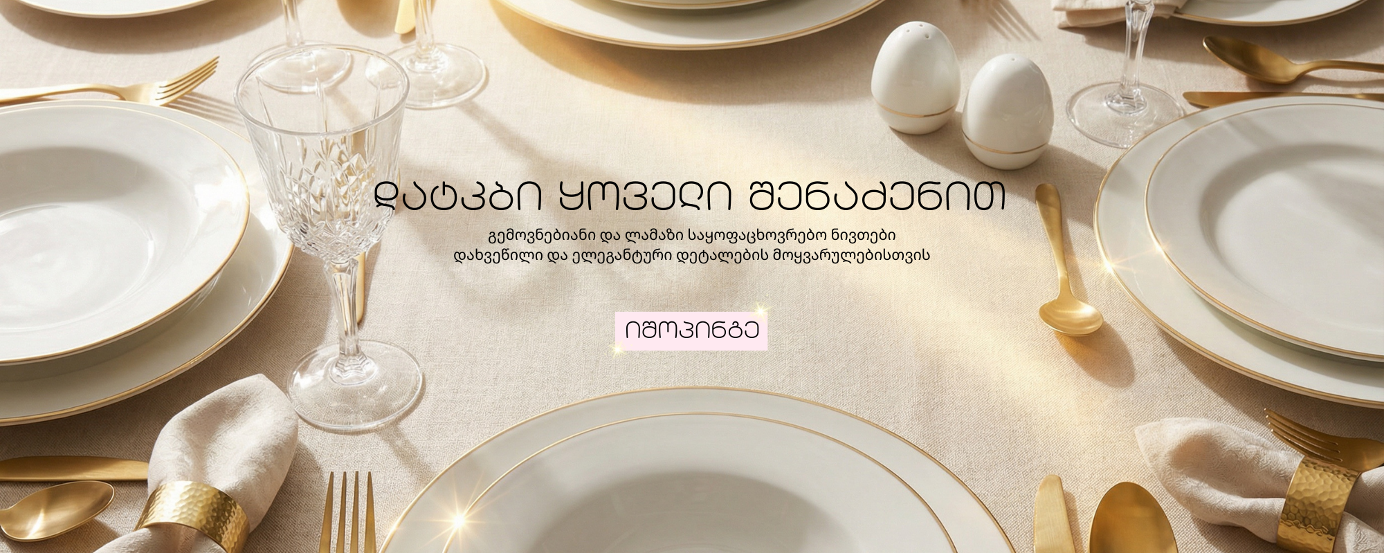 გარდა იმისა რომ თითოეული ნივთის სილამაზე პრიორიტეტია, ყველა ჩვენი პროდუქტი გადის უმკაცრეს შემოწმებას ხარისხთან, უსაფრთხოებასთან და პრაქტიკულობასთან დაკავშირებით. ეს ის ადგილია სადაც თავისუფლად შეგიძლიათ იშოპინგოთ, აარჩიოთ ნებისმიერი პროდუქტი და გაილამაზოთ ყოველდღიურობა ხარისხიანი, საუკეთესო მასალებისგან დამზადებული, ულამაზესი ხარისხის ჭურჭელით და დეკორით.
